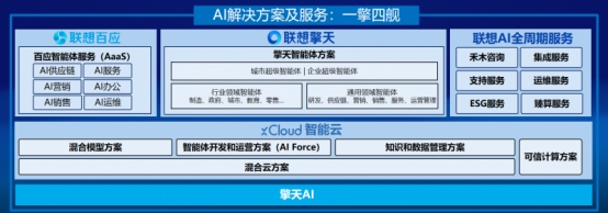 面对国家政策驱动、市场高速增长和行业转型加速的三重机遇,联想方案服务业务主动求变,将AI解决方案及服务战略全面升级为“一擎四舰”,依托擎天4.0,联想打造了由xCloud智能云、联想百应、联想擎天和联想AI全周期服务组成的服务业务群。