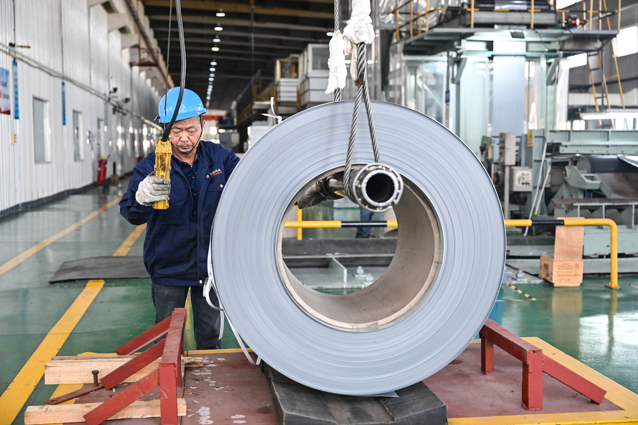 11月25日,在苏州新颖新材料科技股份有限公司,工人吊运冰箱面板半成品。近年来,江苏省苏州市相城区持续优化营商环境,创新推出暖心营商16条,实实在在破解民营企业反映集中的问题,鼓励支持企业创新转型,切实推动民营经济发展壮大。