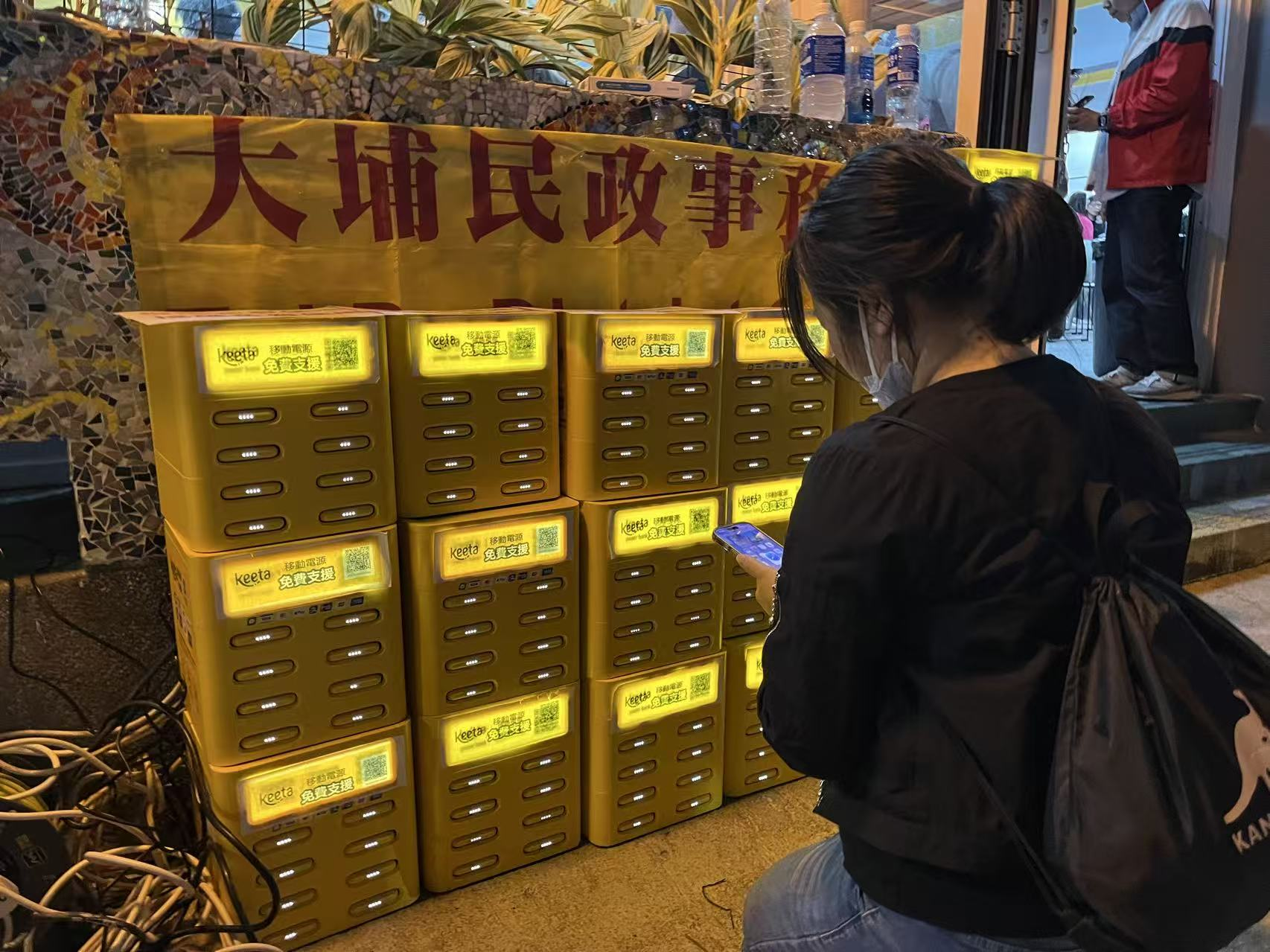 ▲美团Keeta紧急调动的免费移动充电宝机柜已安装于大埔临时社区物资中心。 佳音 摄