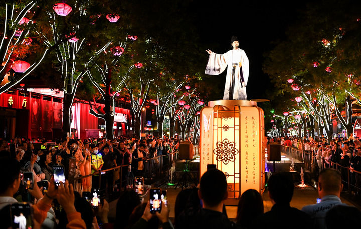 华灯初上,大唐不夜城一处高台上,诗仙“李白”凌空而立,与数百名游客齐诵《蜀道难》,蔚为壮观。