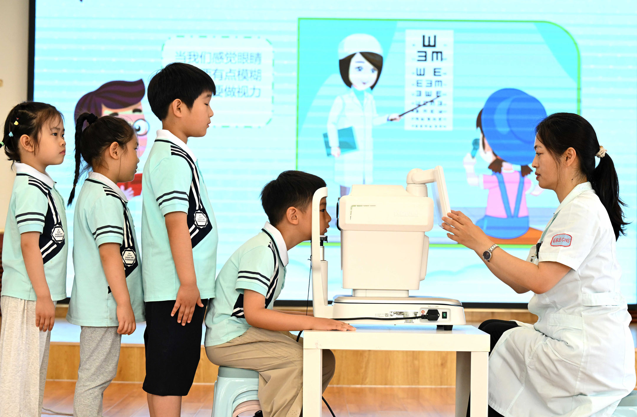 在河北省石家庄市新华区柏林幼儿园,社区医护人员为小朋友做视力检查。资料图片
