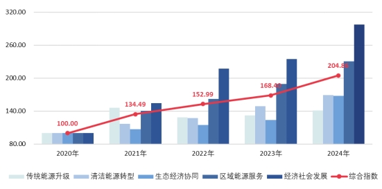 核心结果显示,2024年指数综合得分为204.86点,同比增长21.65%,五年累计增长104.86%,年均复合增长率达19.64%,呈现“稳步攀升、结构优化、质效双升”的总体特征,“十四五”以来能源高质量发展目标任务超额完成、转型成效远超预期。内蒙古能源经济逐步实现从规模扩张为主转向质量效益优先、从单一能源生产转向多维度协同发展、从传统能源依赖转向绿色转型引领的三大关键转变。