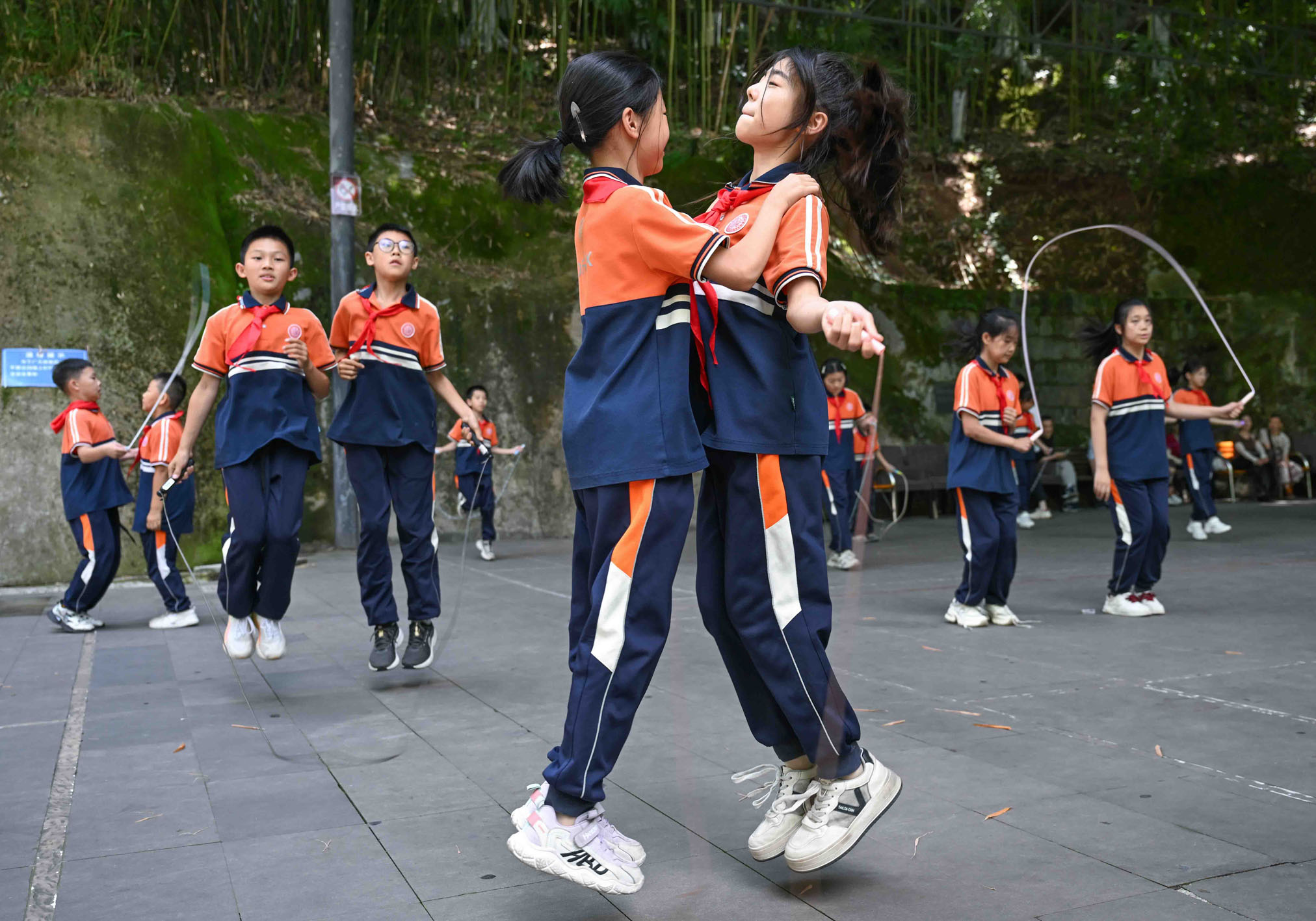 图为今年5月重庆市垫江县凤山小学学生在凤山公园练习花式跳绳。新华社记者 陈诚 摄