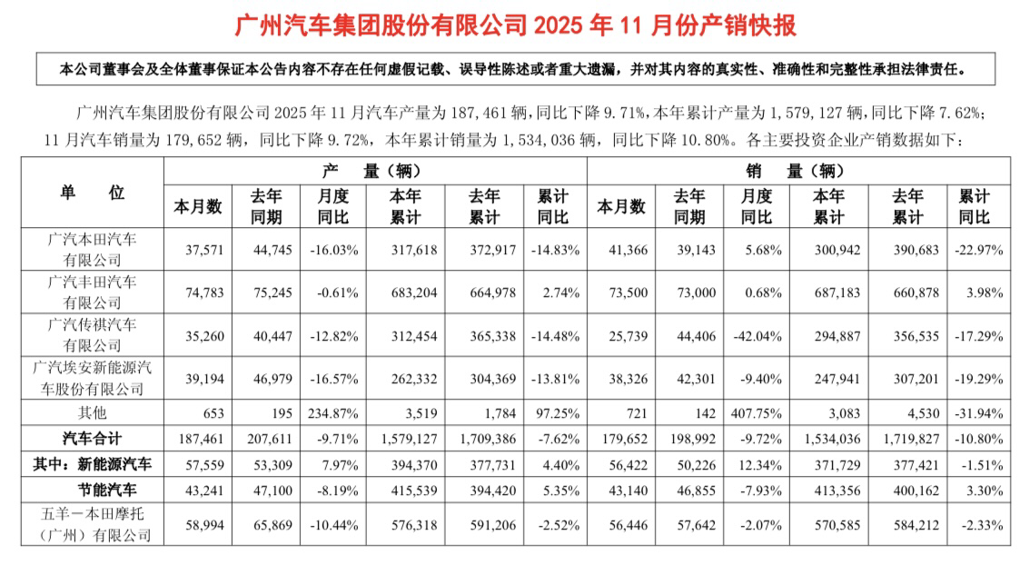 12月5日,广汽集团发布2025年11月产销快报。数据显示,集团11月汽车销量为179,652辆,同比下降9.72%。值得关注的是,旗下自主品牌广汽传祺当月销量为25,739辆,同比下降达42.04%。