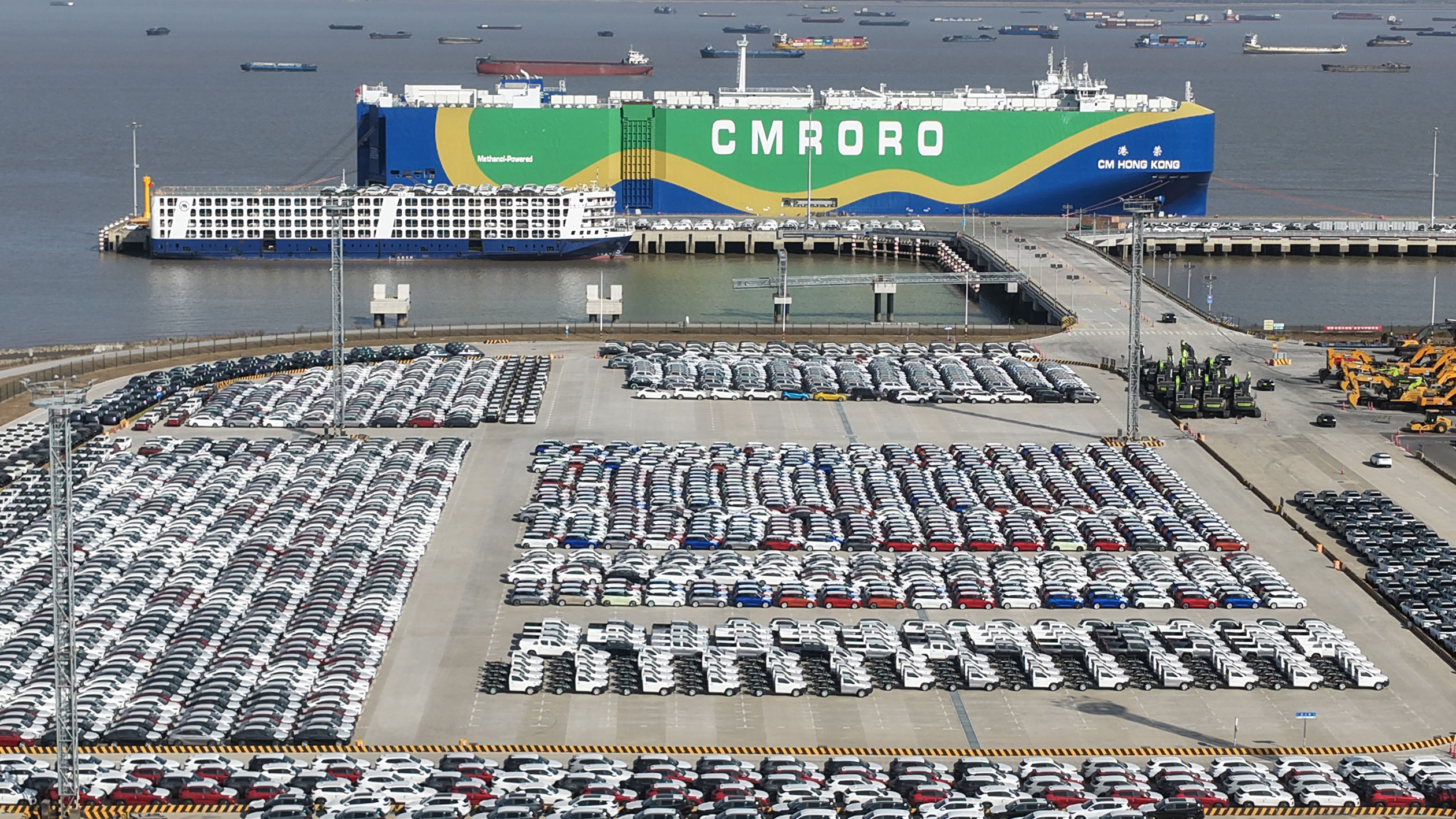 12月9日,在江苏省苏州港太仓港区,“港荣”号甲醇双燃料动力滚装船在装载出口汽车(无人机照片)。今年1至11月,太仓海关监管的太仓口岸出口汽车约77万台,同比增长76.5%,出口至比利时、巴西、沙特等170余个国家和地区。