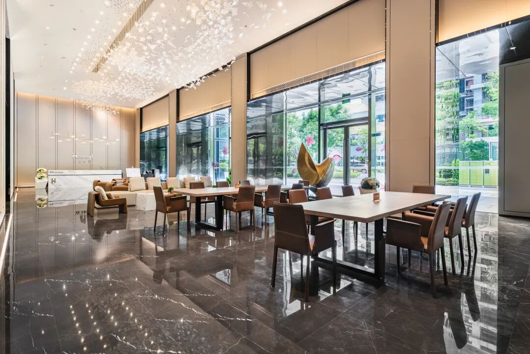 面对高难度土地条件,广州保利和寓大源店以“极致坪效革命”回应挑战。通过精准的客群洞察,将仅0.4㎡/间的公区配比,创新转化为490㎡的复合功能大堂,集成影音、健身、学习等多重场景。这不仅是空间的巧妙利用,更是对青年“第三空间”需求的深刻理解与创造性满足。