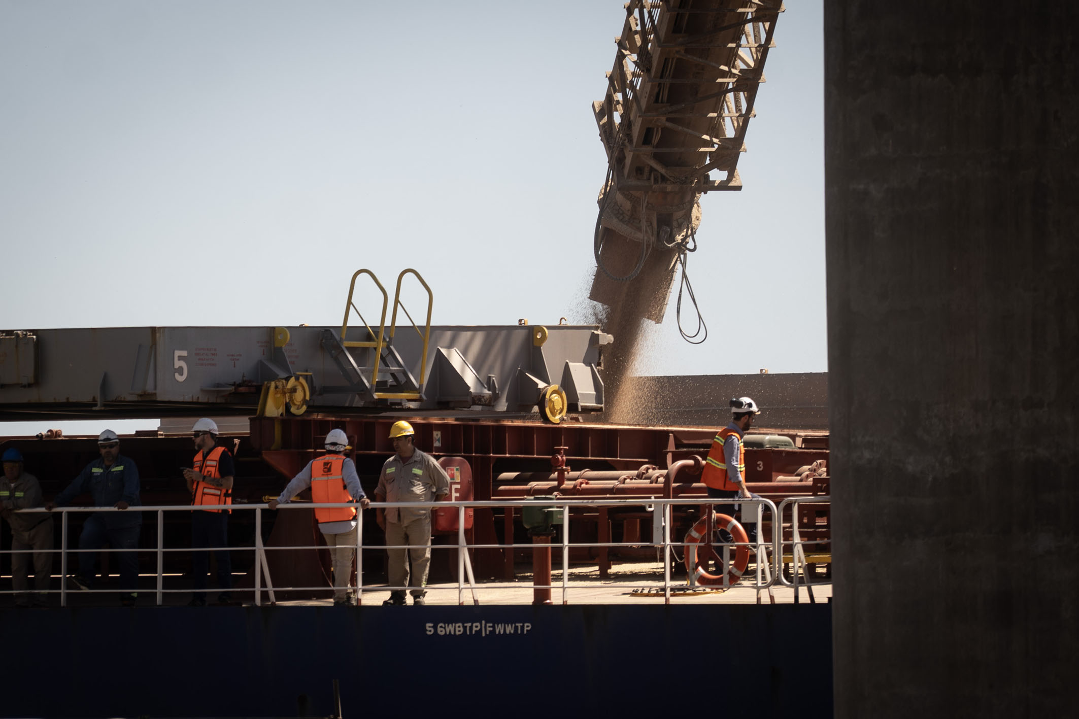 一艘装载6.5万吨阿根廷小麦的货轮近日从该国圣菲省廷布埃斯港启航前往中国。这是阿根廷2024年1月获得对华小麦出口资质后首次向中国开展小麦商业出口。图为在阿根廷圣菲省廷布埃斯港,工作人员在一艘装载阿根廷小麦的货轮旁工作。