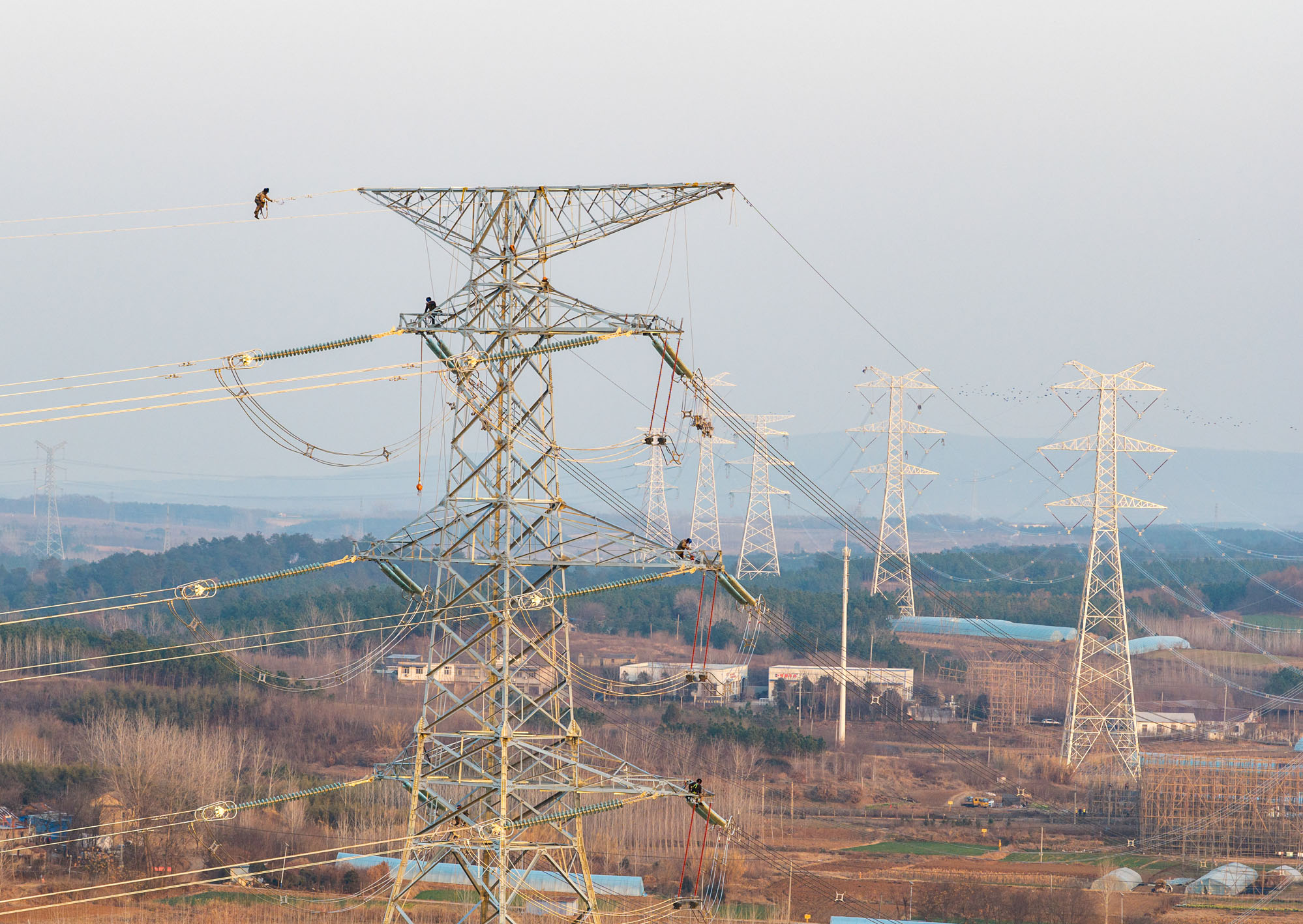 12月17日,由安徽送变电工程有限公司施工的安徽香涧至鹭岛500千伏线路工程顺利实现主体完工。图为施工人员在施工现场进行高空作业。