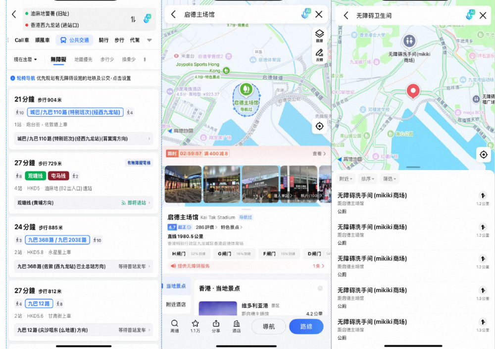 针对香港出行场景的特殊性,高德无障碍导航进行了精准适配与资源整合。目前已上线1000余条无障碍巴士线路,收录数千个无障碍设施点位,涵盖无障碍直梯、无障碍洗手间、无障碍通道等核心公共设施,同时覆盖90余个重要场所,包括赛事场馆、交通场站、酒店及购物中心等,用户通过高德App搜索,即可一键查询这些场所的无障碍出入口、设施分布等关键信息。在导航体验上,用户开启“无障碍模式”后,系统将自动优先推荐配备无障碍直梯、升降机的地铁及有无障碍设施的公交路线。