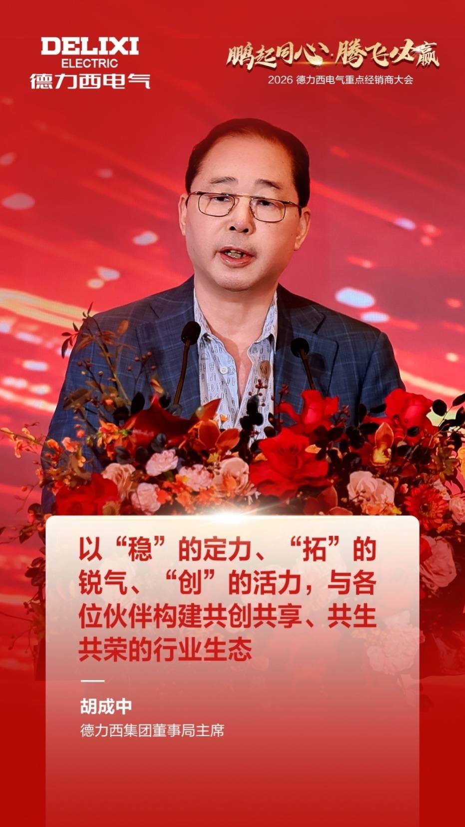 会议最后,德力西集团董事局主席胡成中发表总结致辞:“回望2025年的每一步前行,我们始终与各位经销商伙伴同心同德,这些成就的背后,离不开各位经销商伙伴的辛勤付出以及在一线市场的坚守开拓。在此,我谨向每一位合作伙伴表达最诚挚的谢意!