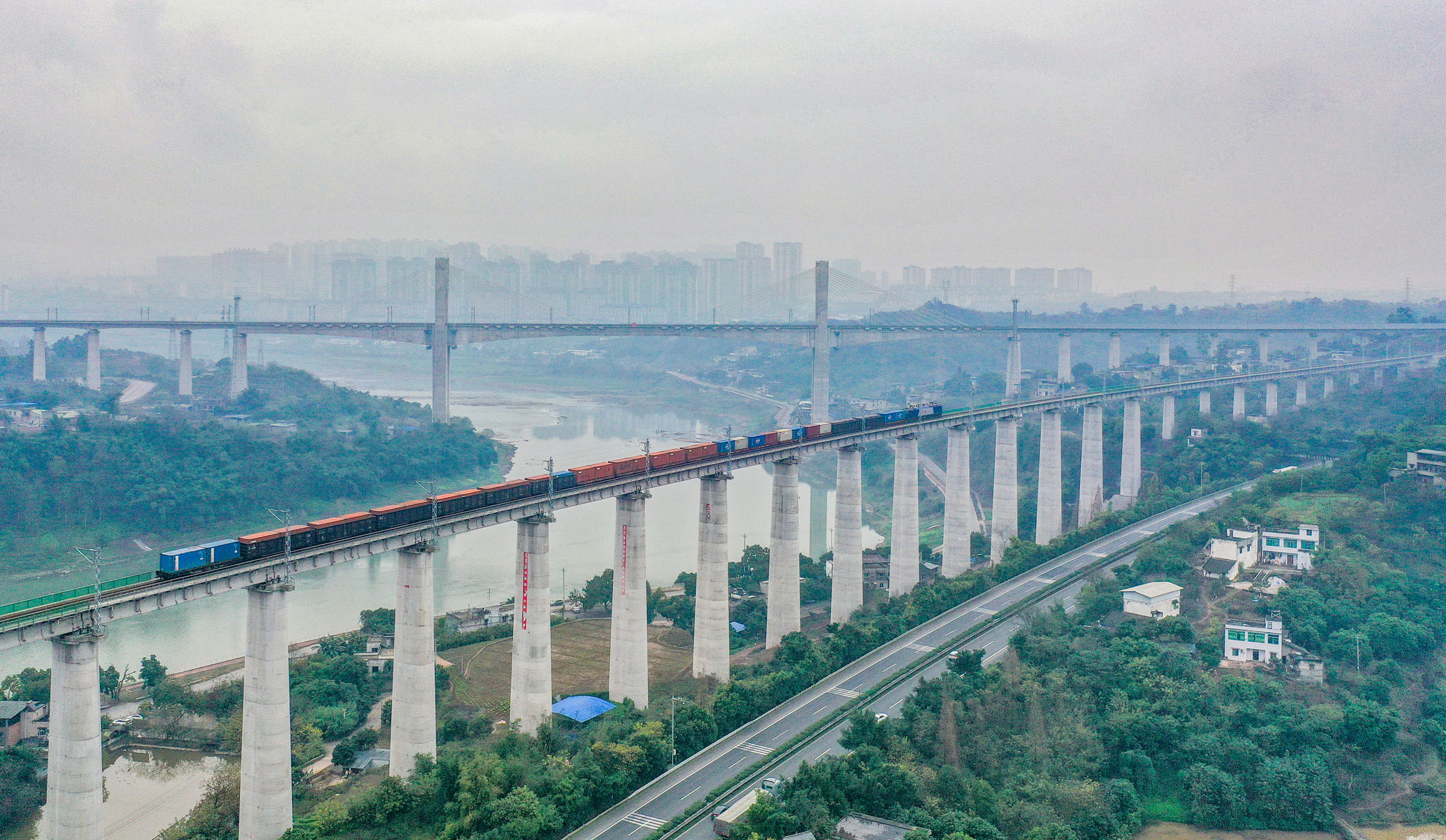 图为12月25日,隆泸叙铁路首发货运列车驶过泸州金山沱江铁路大桥(无人机照片)。