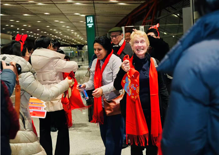 一出舱门,游客们就被憨态可掬的“北京礼物”马墩墩人偶吸引,争相合影留念。“我之前在这里生活学习过,很有感情,所以看到有合适的航班,我就买了来北京的机票,很期待此次中国之行。”德国游客Moriz难掩兴奋。来自北京的欢迎仪式与伴手礼,更让Moriz切实体会到这座城市的温暖。
