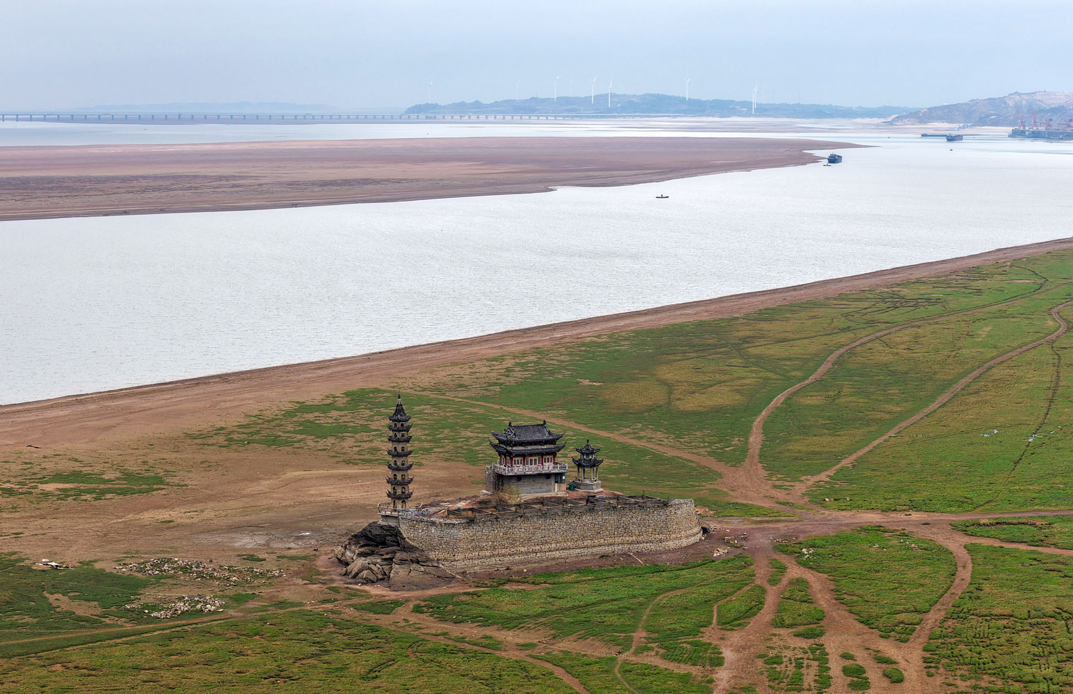 鄱阳湖水位下降,湖区的千年石岛落星墩完全展露出来(2025年12月13日摄,无人机照片)。新华社发(韩俊烜 摄)