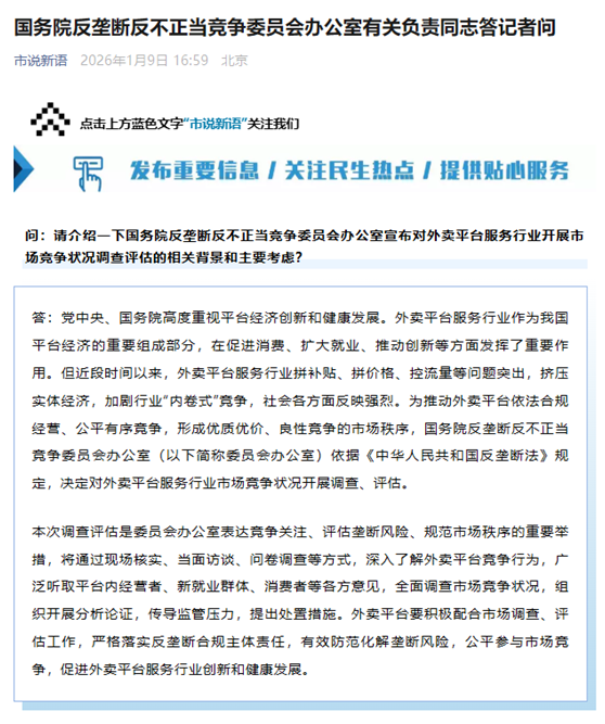 国务院反垄断反不正当竞争委员会办公室有关负责同志答记者问时表示,党中央、国务院高度重视平台经济创新和健康发展。外卖平台服务行业作为我国平台经济的重要组成部分,在促进消费、扩大就业、推动创新等方面发挥了重要作用。但近段时间以来,外卖平台服务行业拼补贴、拼价格、控流量等问题突出,挤压实体经济,加剧行业“内卷式”竞争,社会各方面反映强烈。为推动外卖平台依法合规经营、公平有序竞争,形成优质优价、良性竞争的市场秩序,国务院反垄断反不正当竞争委员会办公室依据《中华人民共和国反垄断法》规定,决定对外卖平台服务行业市场竞争状况开展调查、评估。