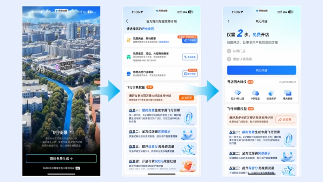 据高德商家成长负责人介绍,“飞行街景”的操作过程对商家十分友好。商家在高德APP搜索“烟火好店”完成预约后,仅需一部智能手机,根据指引拍摄并上传店内视频和门头照片,即可免费生成专属的“飞行街景”。