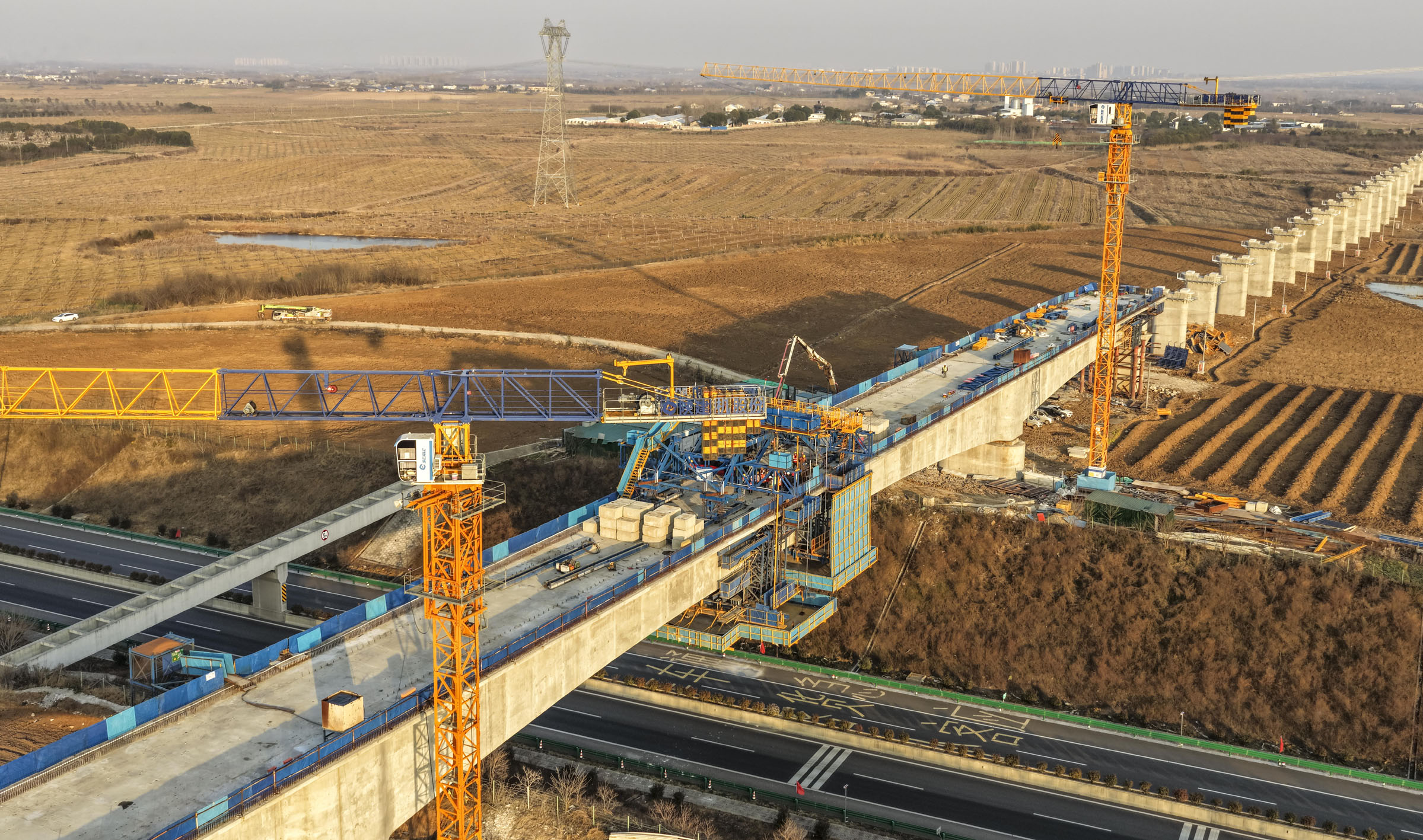 图为进行合龙施工的合武高铁庐安特大桥跨德上高速连续梁(1月12日摄,无人机照片)。