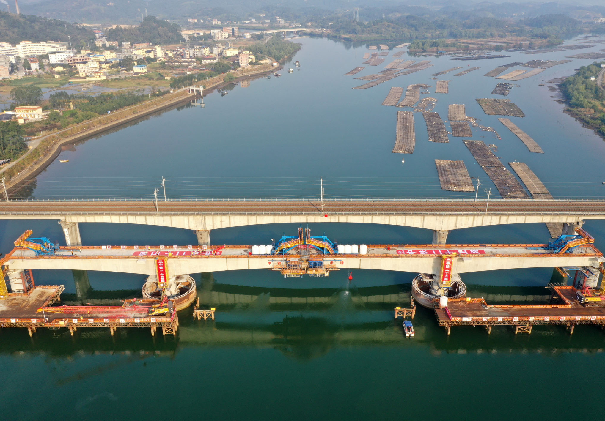 图为连续梁主跨合龙后的南防铁路茅岭江特大桥(1月13日摄,无人机照片)。