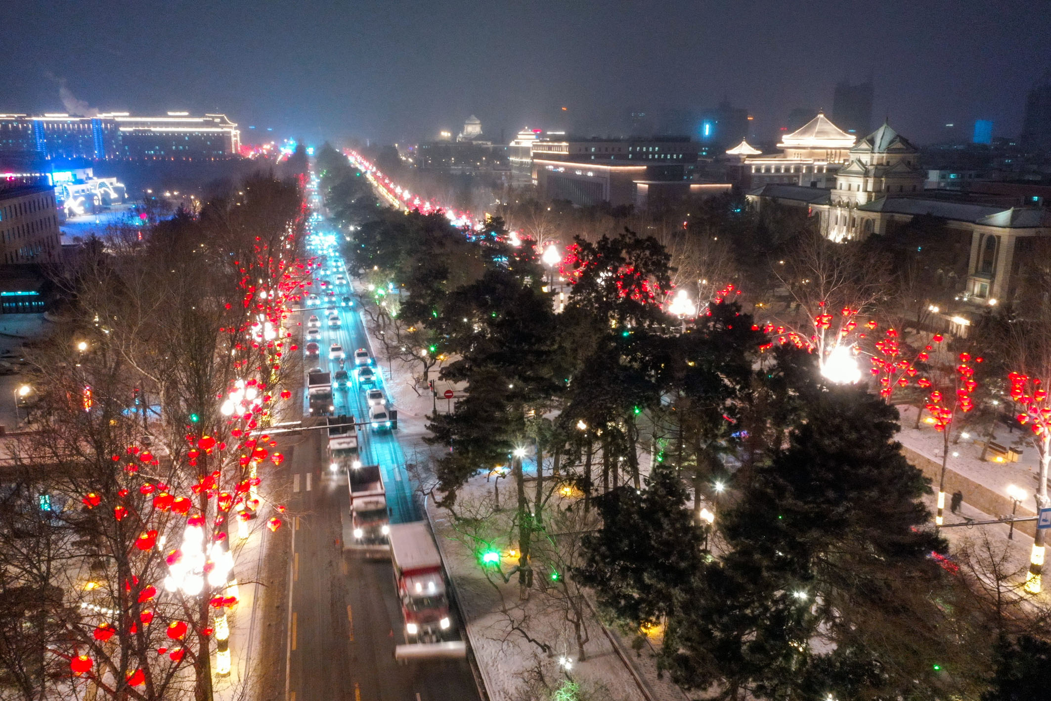 环卫工人驾驶清雪车辆在长春市新民大街清雪(无人机照片)。记者 张楠 摄