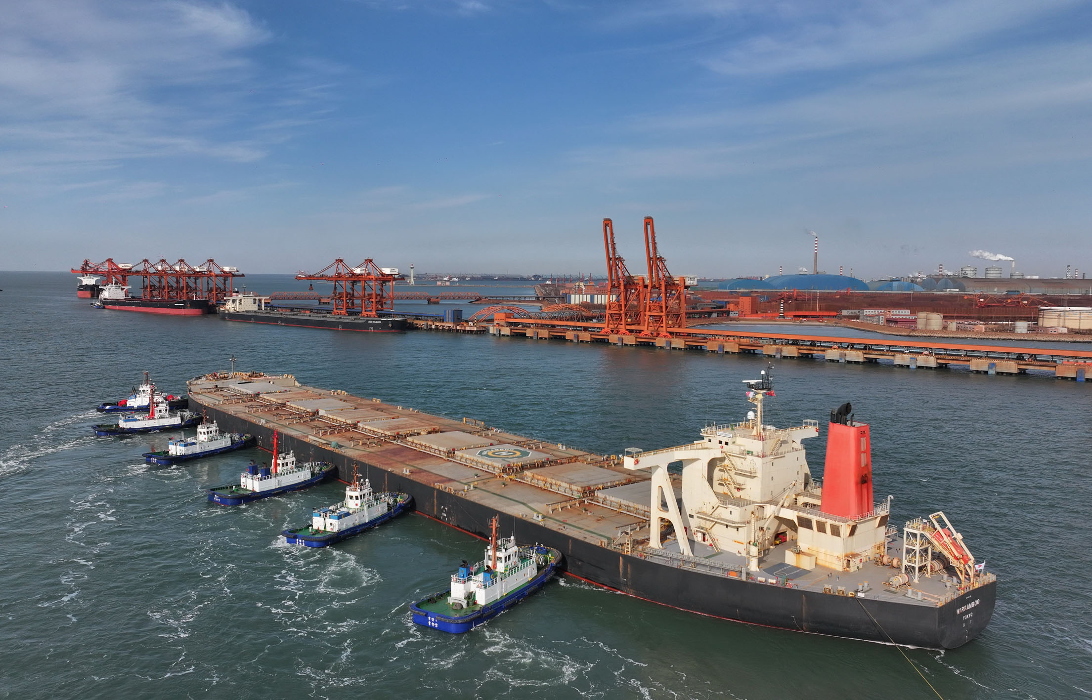 1月13日,一艘轮船在拖轮协助下向唐山港曹妃甸港区矿石码头靠泊(无人机照片)。记者从河北省唐山市海洋口岸和港航管理局获悉,2025年,唐山港全港完成货物吞吐量88399万吨,同比增长2.53%。