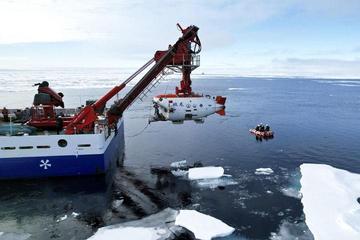 2025年8月11日,“蛟龙”号在北极冰区准备下潜。新华社记者 刘诗平 摄