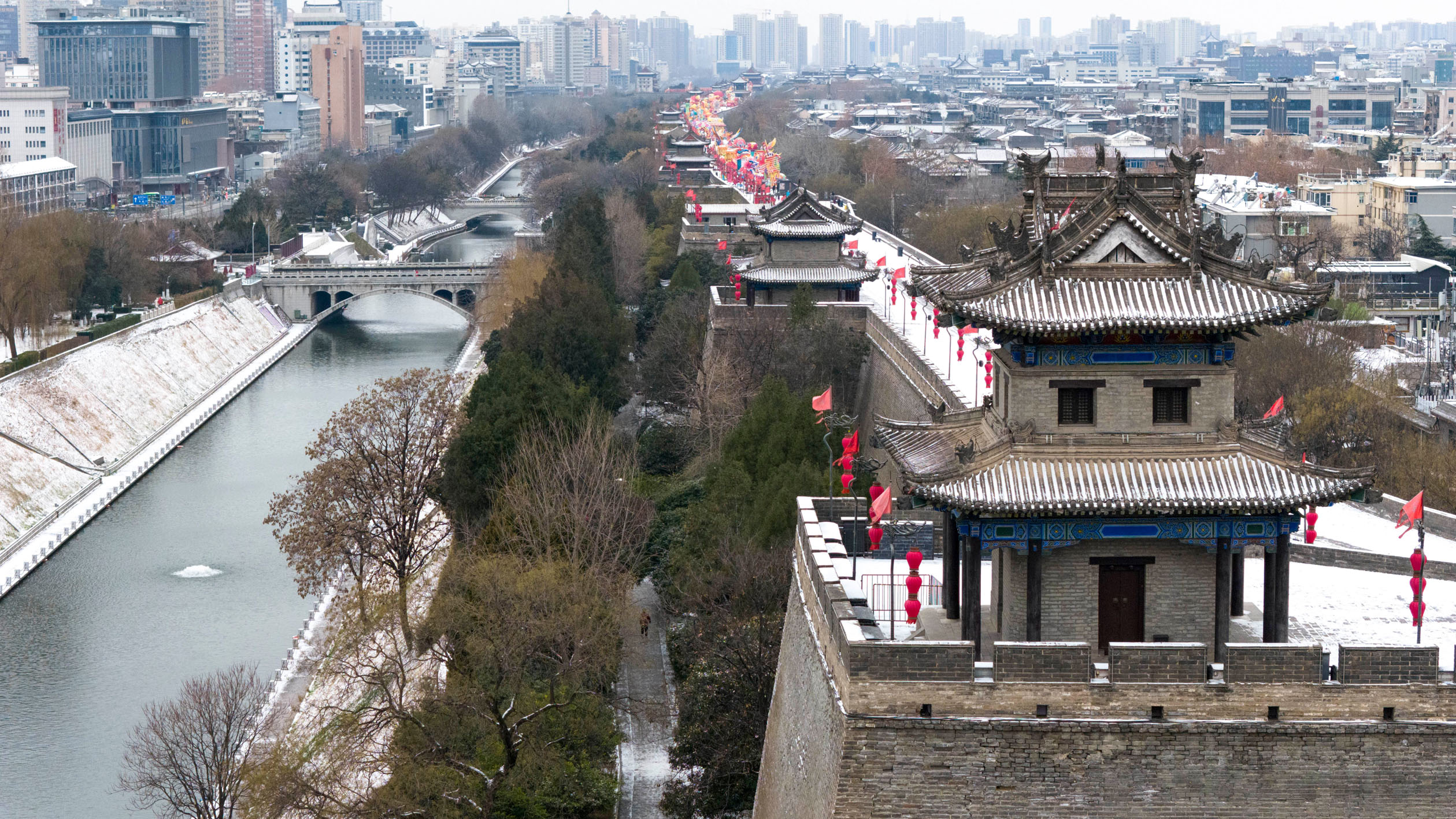 图为西安城墙东南角及护城河(无人机照片,1月20日摄)。