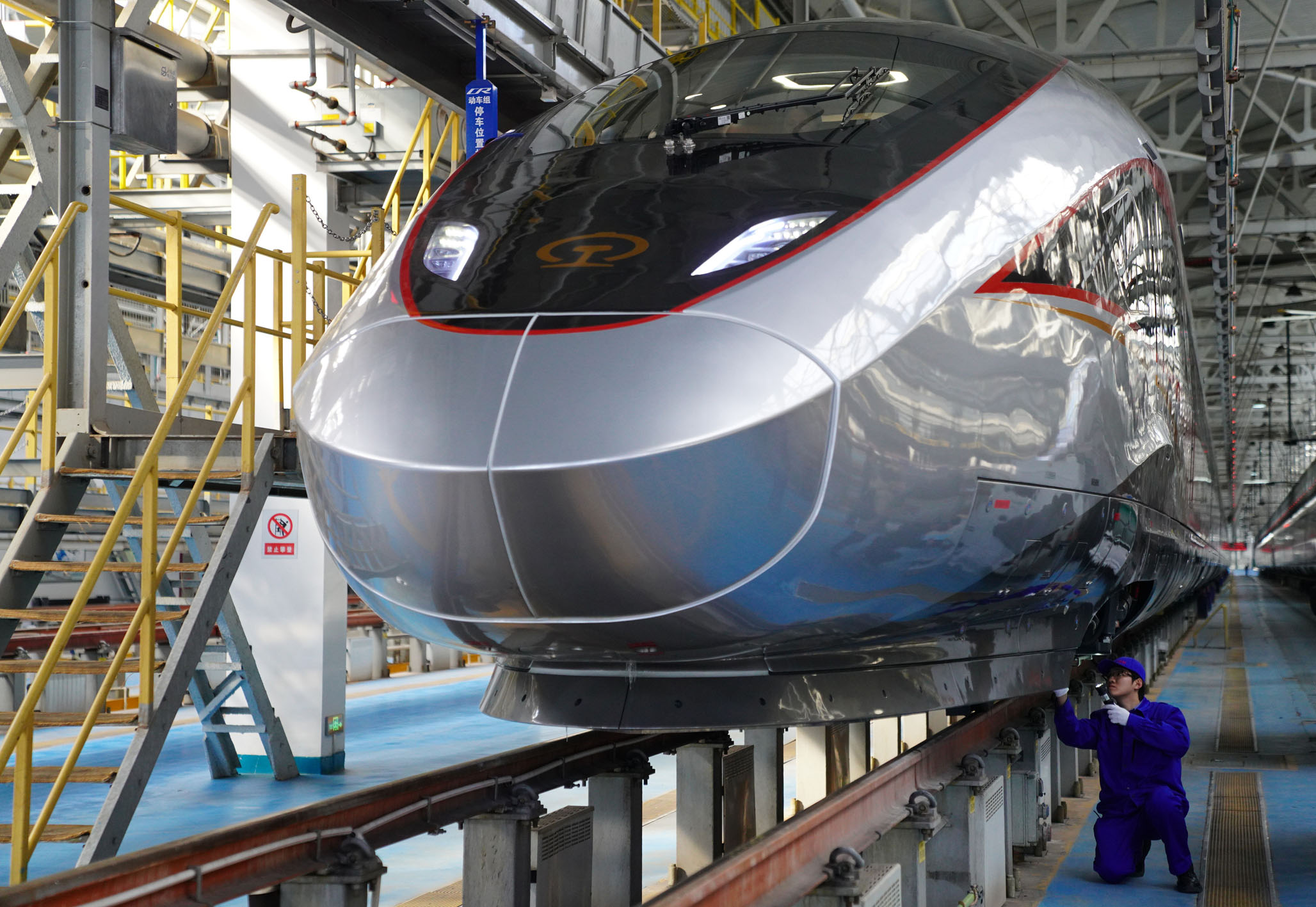 1月20日,中国铁路北京局集团有限公司北京动车段的工作人员在朝阳动车所检修动车组列车。春运临近,中国铁路北京局集团有限公司通过高科技设备加强对动车组司机的模拟实训和动车组列车及轨道线路的检修维护,全力保障旅客平安出行。
