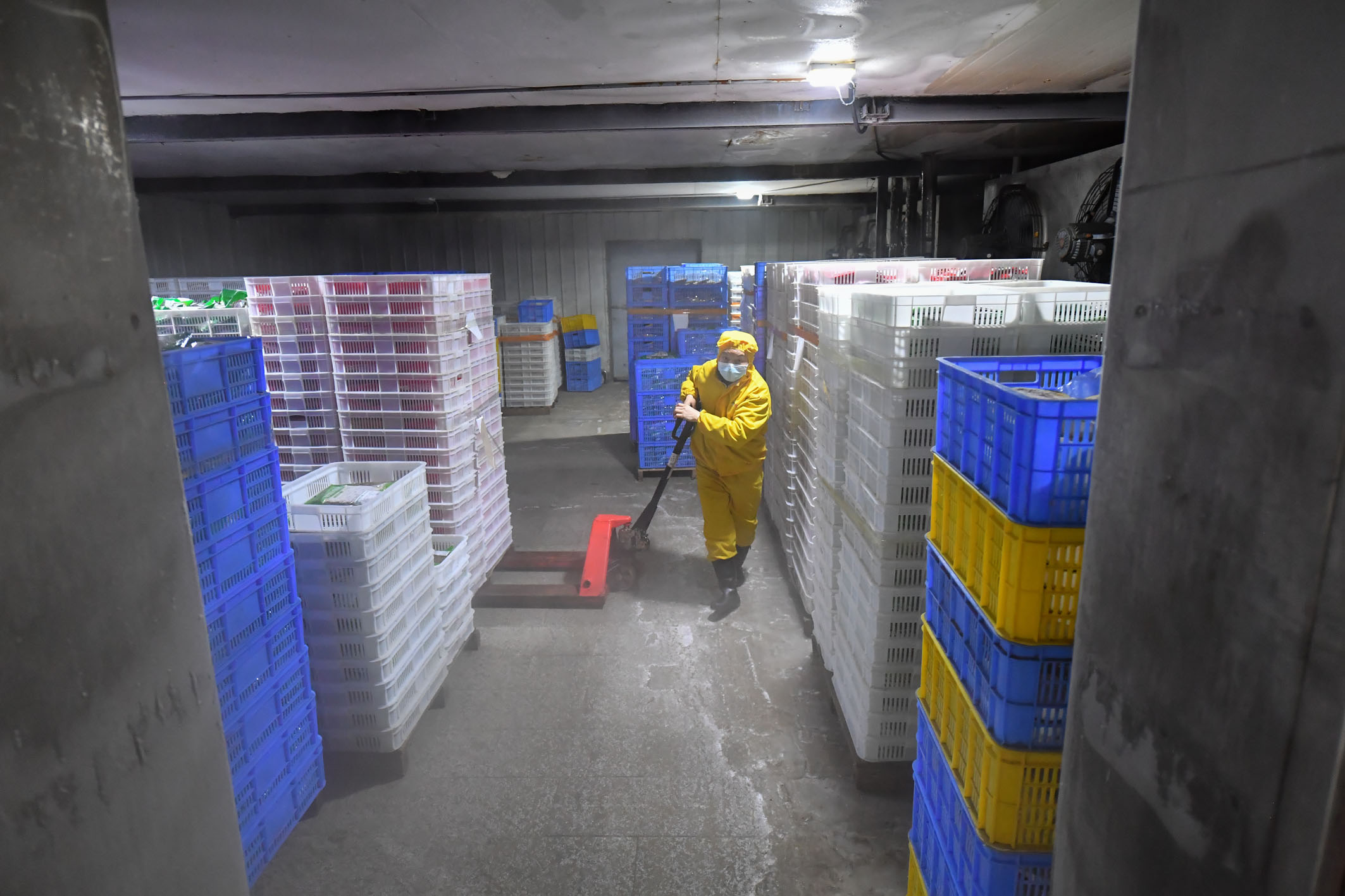 图为湖南省浏阳市省级农业科技园区一家预制菜企业工作人员在冷库搬运预制菜成品。(资料照片)