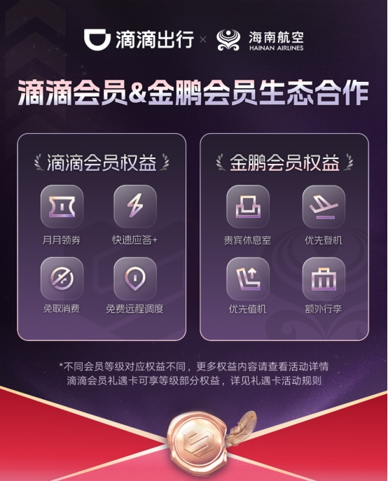 滴滴会员携手海航金鹏俱乐部上线联合会员权益