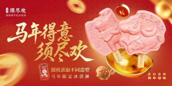 作为伊利旗下高端冰品品牌,须尽欢推出马年尽欢系列盲盒冰淇淋,以“马年得意须尽欢”为主题,将传统文化元素与现代盲盒玩法相结合。该产品设计“马上来财”与“立马抱富”两款造型,分别以骏马驮元宝、小马抱钱币为意象,传递新春财运亨通的美好寓意。消费者通过盲盒形式随机获取,增强了产品的互动体验与社交属性。