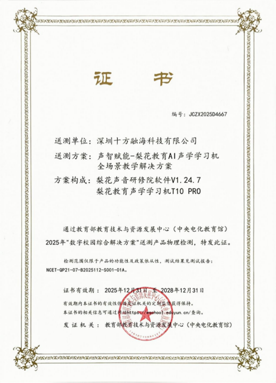近日,教育部教育技术与资源发展中心(中央电化教育馆)正式公布2025年“数字校园综合解决方案”测试合格名单。由十方融海梨花教育自主研发的“声智赋能——梨花教育AI声学学习机全场景教学解决方案”,凭借其创新的软硬件协同设计与卓越性能,成功入选该名单,成为服务于中老年群体文化素养提升的领先数字化教学方案之一。