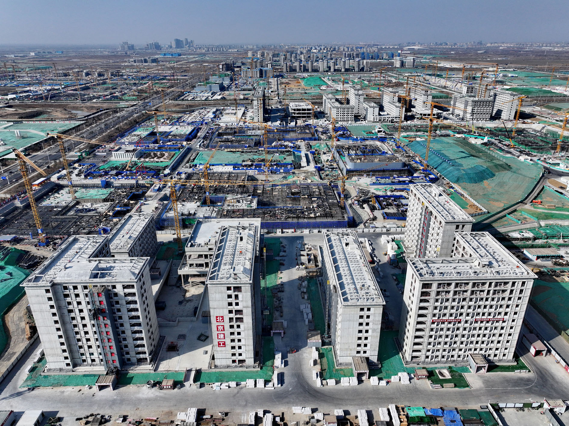 时下,首批4所疏解高校雄安校区已进入大规模加速建设阶段。这是位于雄安新区起步区的首批4所疏解高校雄安校区建设现场,由远及近依次为北京交通大学雄安校区、中国地质大学(北京)雄安校区、北京科技大学雄安校区和北京林业大学雄安校区(2月11日摄,无人机照片)。