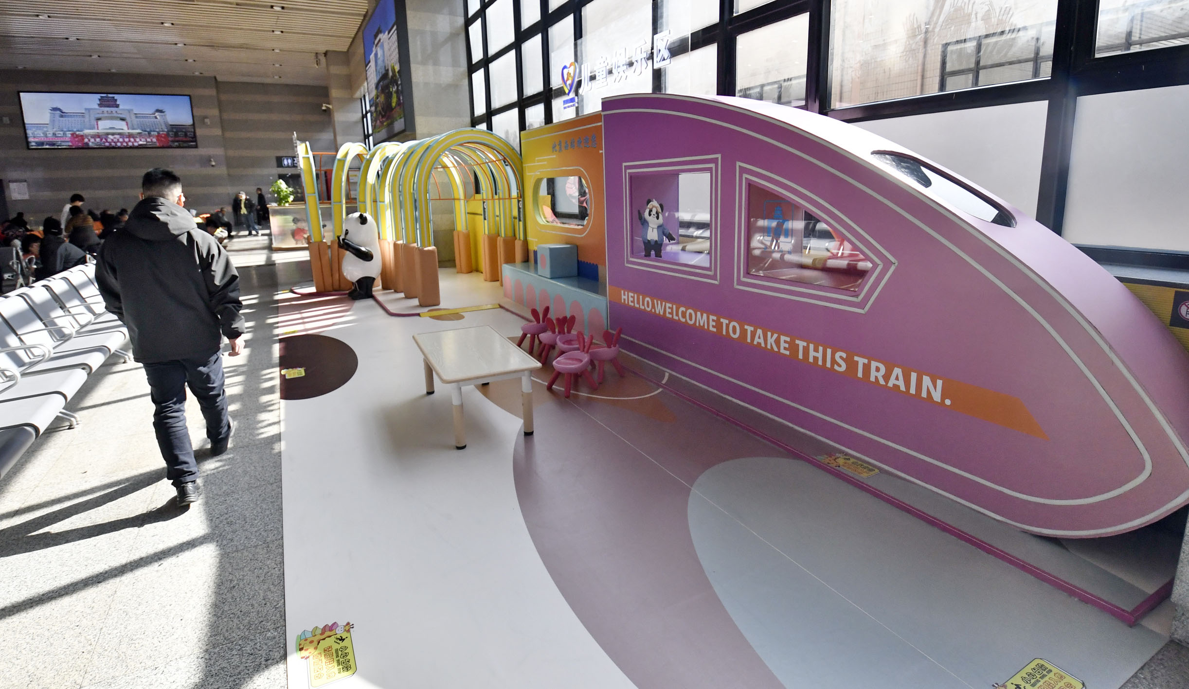 图为2月12日拍摄的北京西站候车大厅内的儿童候车游乐区。