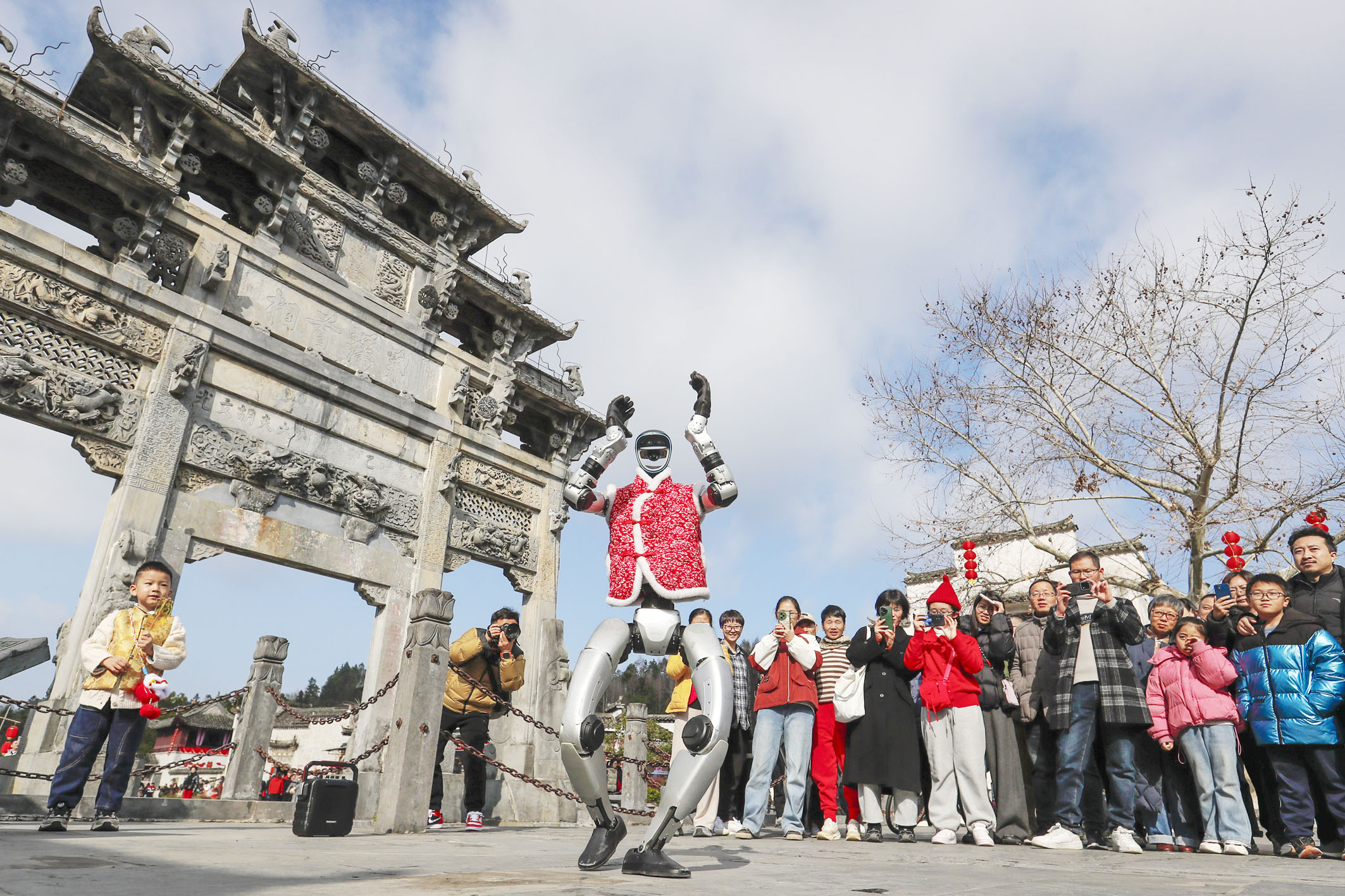 2月18日,游客在安徽省黟县西递古村观看机器人表演。新华社发(施亚磊 摄)