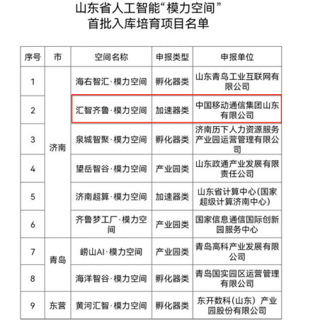 近日,山东省工业和信息化厅正式发布《山东省人工智能“模力空间”首批入库培育项目名单》。山东移动申报的“汇智齐鲁·模力空间”项目成功入选首批培育项目(加速器类),标志着公司在人工智能领域的创新实力获得省级权威认可。