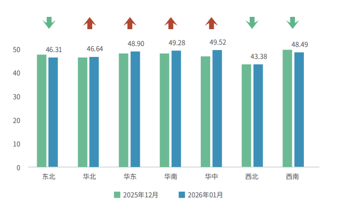 分区域来看,七大区域经营景气度指数呈现4升3降。其中,华北、华东、华南、华中地区指数有所上升,分别为46.64、48.90、49.28和49.52点,东北、西北和西南地区指数有所下降,分别为46.31、43.38和48.49点。