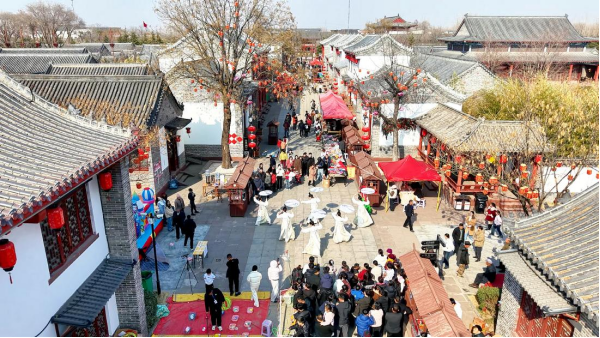 莒南大店庄园内国风巡游表演。离天马岛不远的大店庄园,同样人气爆棚、年味十足。青砖黛瓦间,状元巡游、古舞杂技、非遗展示等精彩节目轮番上演,演员们身着传统服饰,演绎着千年民俗风情,让游客从“观景”向“入景”转变,在沉浸式体验中感受传统文化的魅力,让乡愁在民俗盛宴中得以安放。