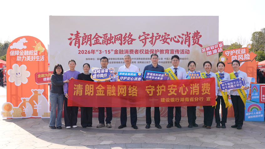 3月14日,浏阳市市政东广场人头攒动,由国家金融监督管理总局湖南监管局、中共湖南省委金融委员会办公室、中国人民银行湖南省分行等六家单位共同指导,40余家在湘银行、保险、证券机构共同主办的“清朗金融网络,守护安心消费”湖南省2026年“3·15”金融消费者权益保护系列活动在此举行。建行湖南省分行以及下辖浏阳支行,组织“张富清金融服务队”共同参加活动,开展趣味问答,让科普更接地气。国家金融监督管理总局湖南监管局党委书记、局长王吴庆到建行宣教展区督导工作。建行湖南省分行党委委员、副行长邓慧杰参加活动。