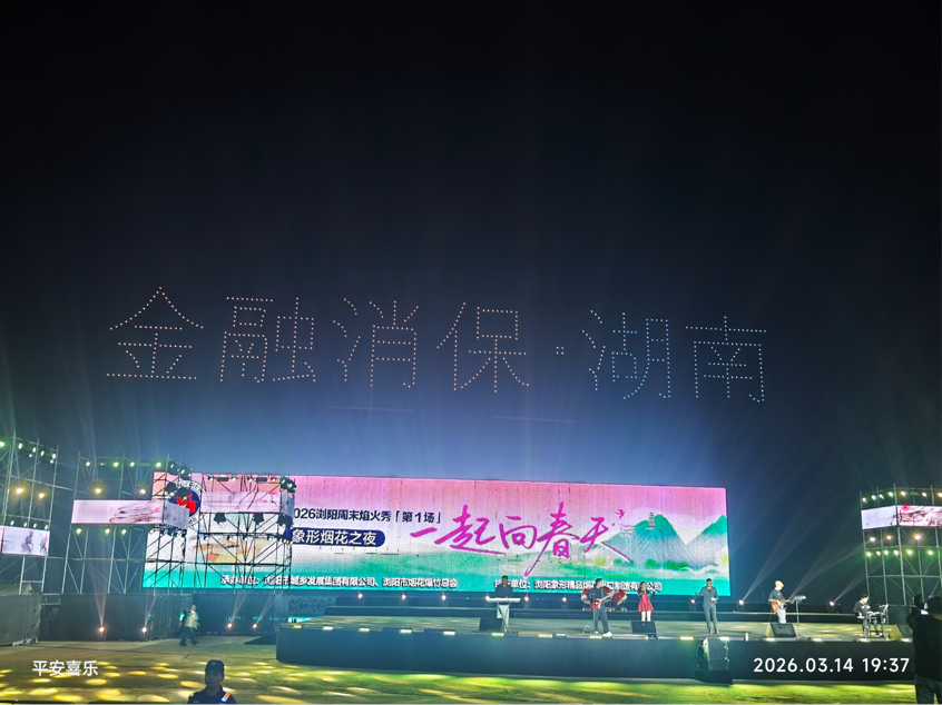 夜幕降临,浏阳天空剧院流光溢彩,一场盛大的“金融消保之夜”主题焰火晚会将活动推向高潮。当晚7:30,千架无人机腾空而起,变幻出金融消保主题画面,烟花秀以“春雷、春雨、春风、春韵”四大篇章呈现,将金融安全理念融入璀璨夜空。建行湖南省分行员工们登台演绎了节目《灯火里的中国》,展现金融机构守护百姓“钱袋子”的温暖承诺。当绚丽的烟花照亮夜空,也照亮了每一位金融消费者安心消费的信心,生动诠释了建设银行“金融为民、守护幸福”的责任担当。