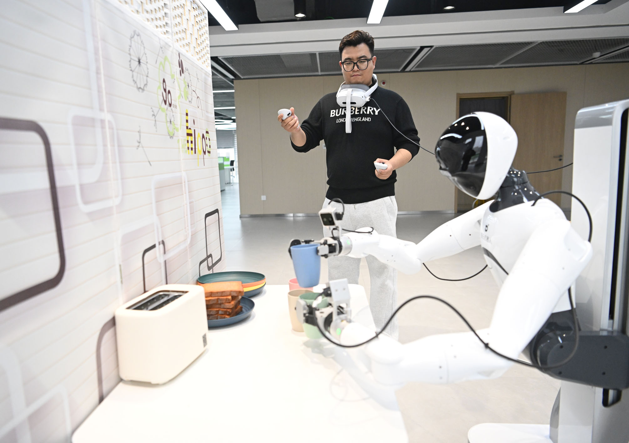 日前,中国雄安集团数字城市科技有限公司具身智能训练场正式投入使用,该训练场采用1∶1实景还原,打造了机器人迎宾导览、工业搬运、家居生活、商业零售、物流装配五大真实场景,开展常态化真机数据采集与标注,收集到的数据向社会开放,助推具身智能技术在城市复杂场景中的规模化应用与商业化落地。图为3月17日,工作人员对机器人进行具身智能训练。