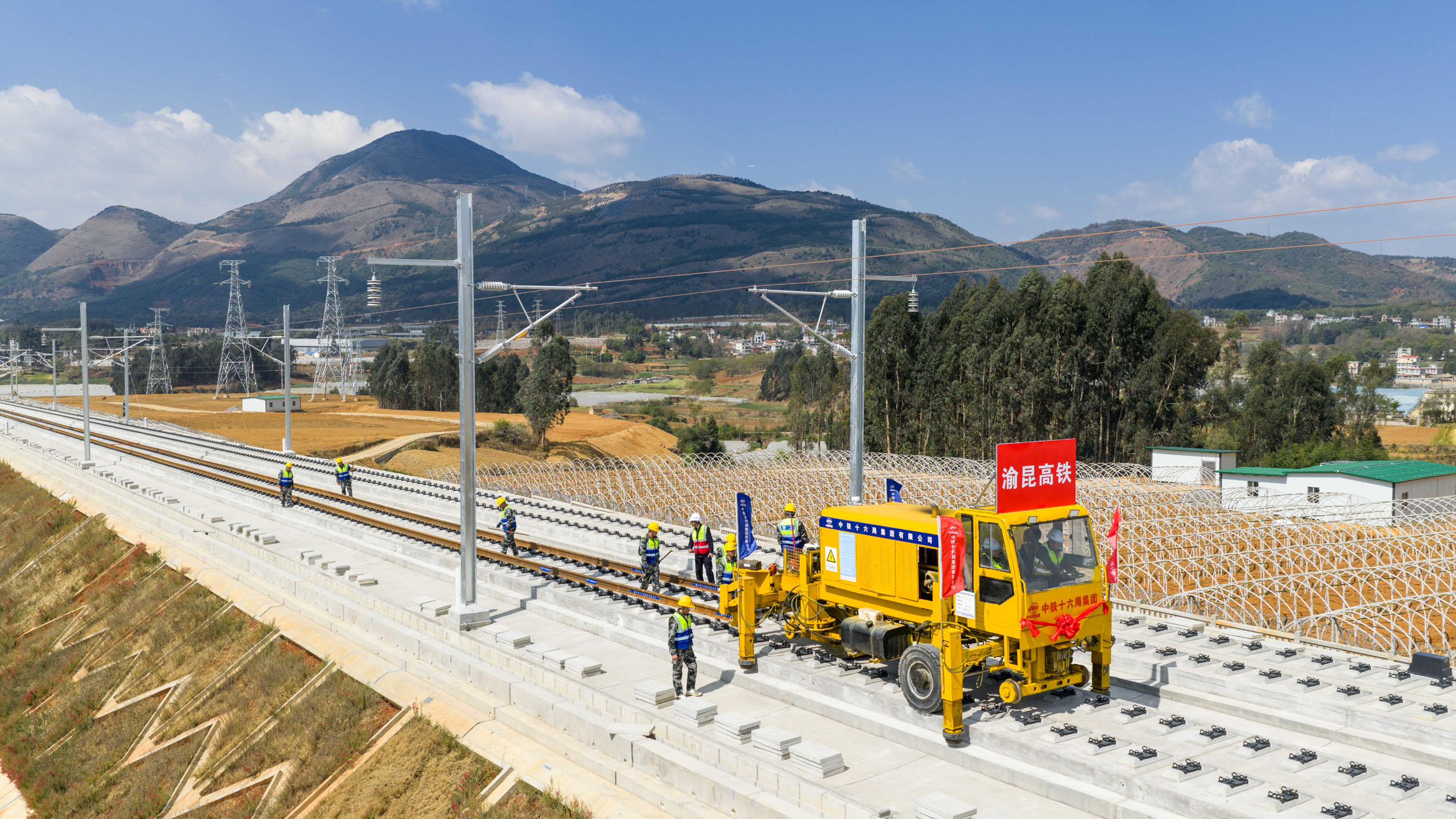 3月18日,在位于云南省昆明市嵩明县的渝昆高铁施工现场,第一对500米长钢轨稳稳落在无砟轨道上,渝昆高铁云南段正式开始铺轨。渝昆高铁是我国“八纵八横”高铁网京昆通道的重要组成部分,线路开通运营后,重庆到昆明的行车时间将压缩至两个半小时左右。