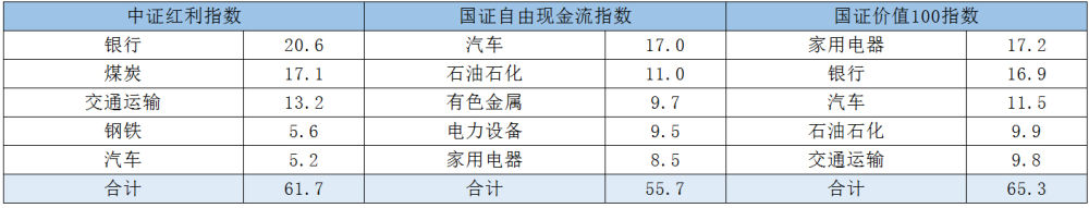 具体从行业分布来看,中证红利指数在银行、煤炭、交通运输等股息率较高的行业上权重占比突出,前五大行业合计权重超60%;国证自由现金流指数重点布局汽车、石油石化等行业;在国证价值100指数中,家用电器、银行等行业权重超过10%,前五大行业集中度最高。
