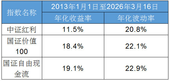 三只指数因选股逻辑不同,呈现出鲜明的风格差异:中证红利指数聚焦股息率进行选股,防御属性突出,波动率相对更低,2013年以来的年化收益率超过10%;国证自由现金流指数侧重自由现金流率选股,成长弹性更强,因此在三只指数中年化收益率最高,达19.1%,同时也伴随着高波动;国证价值100指数则兼顾分红、盈利和现金流,风格更为均衡,历史收益和波动率表现也相对稳健。