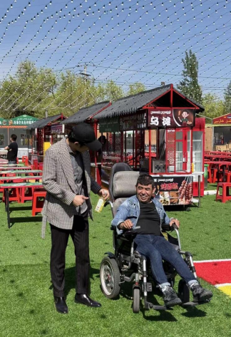 摊主是一位肢体残疾的维吾尔族大叔和一位智力障碍的回族姑娘。这是努尔买买提联合天山区残联进行的精准帮扶实验。天山区残疾人就业所副所长郑卫战介绍说:“我们在网上发布相关信息后,‘利欧纳先生’主动联系到我们进行这次帮扶。”主动捐助但没有主动传播,努尔买买提是想以此为样本,探索如何让不同背景的困难群体在商业中通过合作获得尊严。