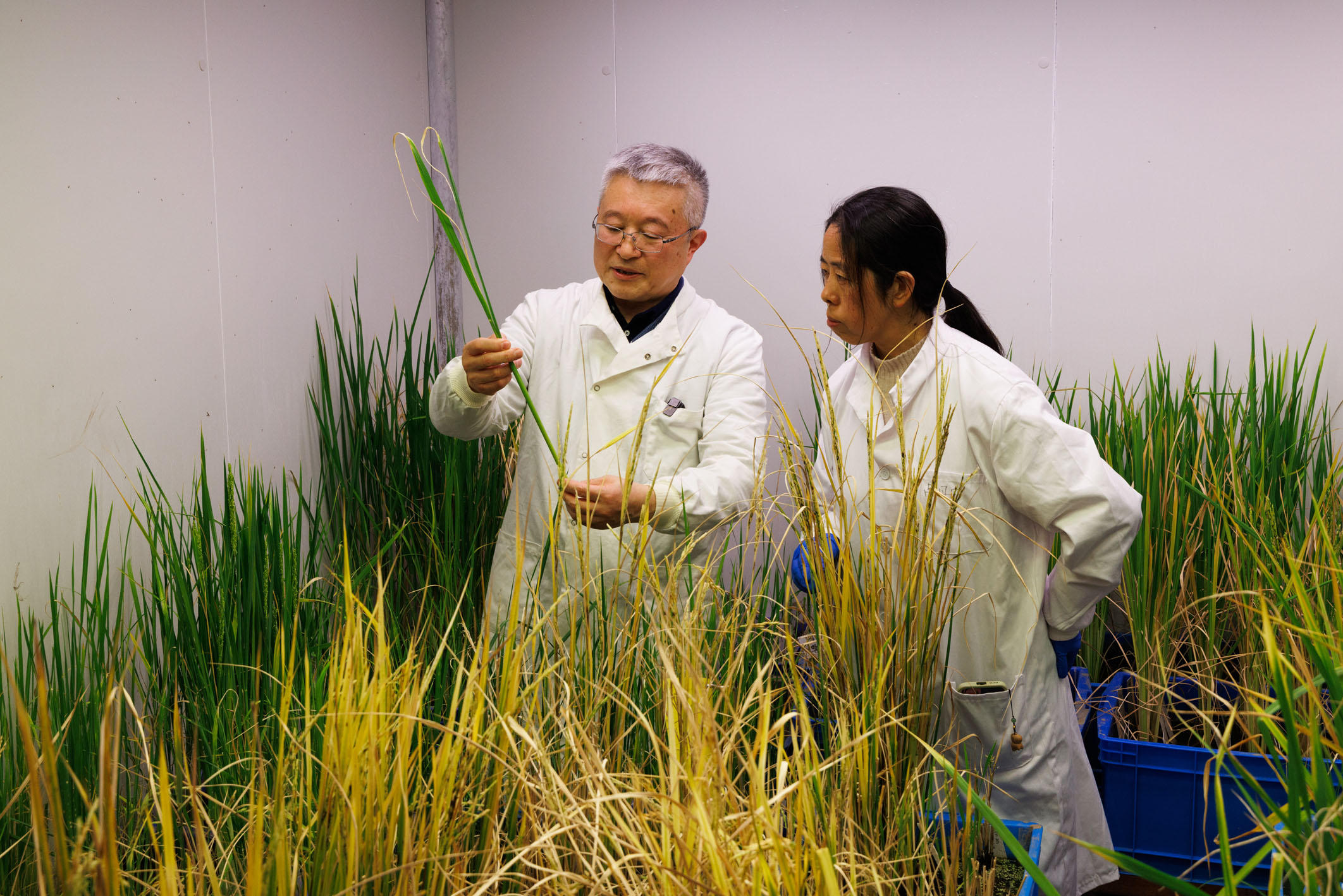 图为近日在中国科学院分子植物科学卓越创新中心温室,韩斌院士(左)和吕丹凤高级工程师在交流水稻植株生长情况。