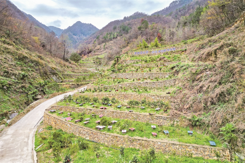 如今,在各级政府的关心和支持下,凤凰山已焕然一新:护坡坚固,梯田平整,石阶通顶;红豆杉亭亭玉立,蜂糖李花朵盈枝;7口冷水鱼塘错落有致,新疆阿勒泰冷水鱼、美国红黑鳟等优质鱼种在水中畅游;300箱蜂群花间采蜜;山泉水厂、蜂蜜水厂建设完工,一座集生态、观光、种植于一体的植物公园在凤凰山里悄然崛起。