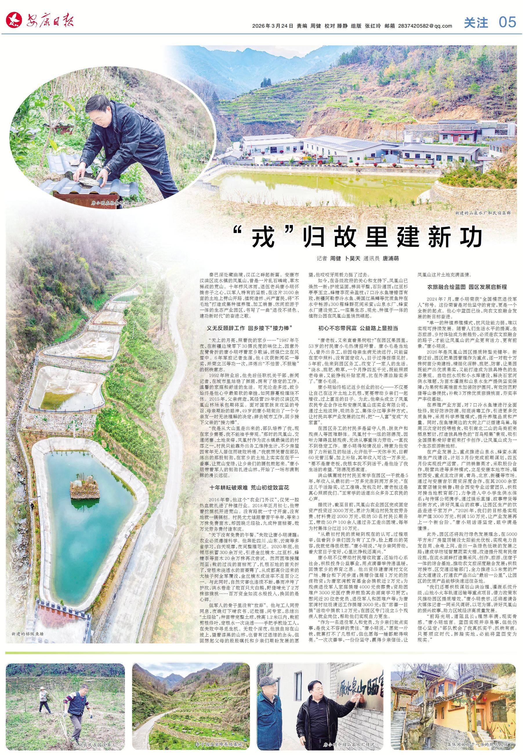 “作为一名退役军人和党员,为乡亲们做点实事,是我义不容辞的责任。”唐小明说,“愿做一斤铁,就算打不了几根钉,但也愿每一锤都敲得响亮。”一次次善举,一份份坚守,赢得乡亲信任,让凤凰山这片土地充满温情。