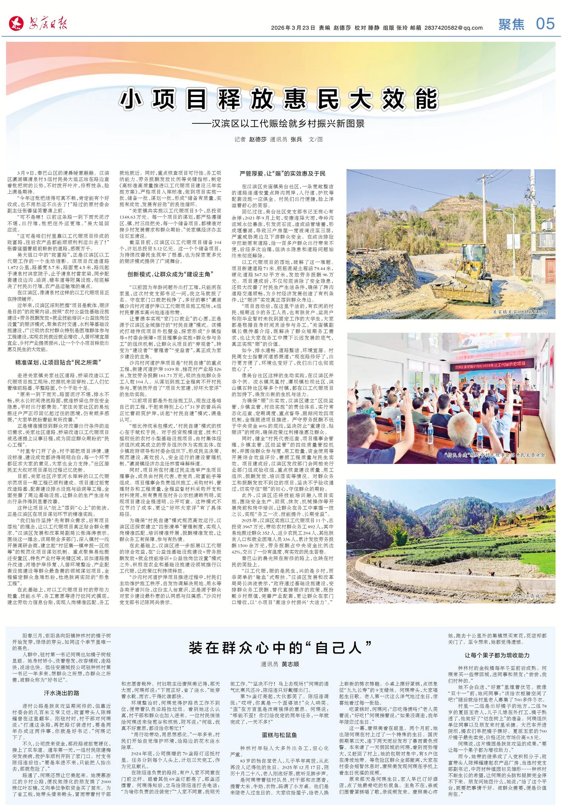 “以工代赈,赈的是民生,兴的是乡村,而非简单的‘输血’式帮扶。”汉滨区发展和改革局局长洪波表示,“政府通过基础设施建设,安排群众务工获酬、替代直接赈济的政策,既扮靓乡村颜值,完善产业配套,更让群众在家门口增收,以‘小项目’激活乡村振兴‘大活力’。”(赵德莎)