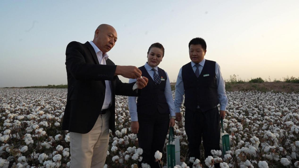 邮储银行工作人员在新疆阿克苏地区与客户了解棉花长势