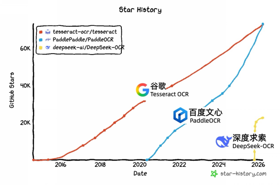 近年来,大模型成为OCR赛道增长的重要动力。Star History数据显示,PaddleOCR在GitHub上的Star自2024年起呈现爆发式增长。2025年以来,OCR更成为大模型厂商布局的重点方向,DeepseekOCR、HunyuanOCR、GLM OCR等产品相继发布。