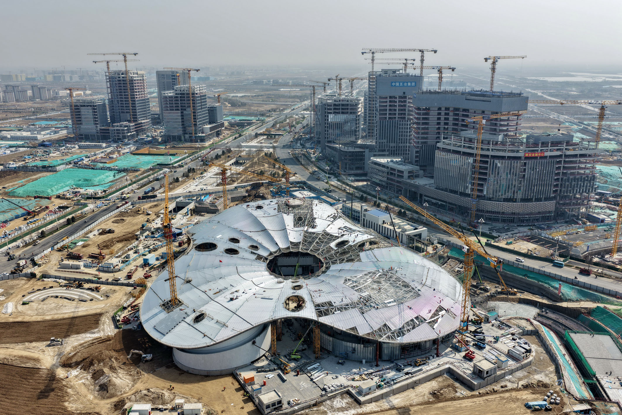 雄安新区启动区城市文化广场项目建设现场(4月2日摄,无人机照片)。目前,雄安新区启动区城市文化广场项目主体结构已经封顶,正在进行装饰装修、幕墙和机电施工。